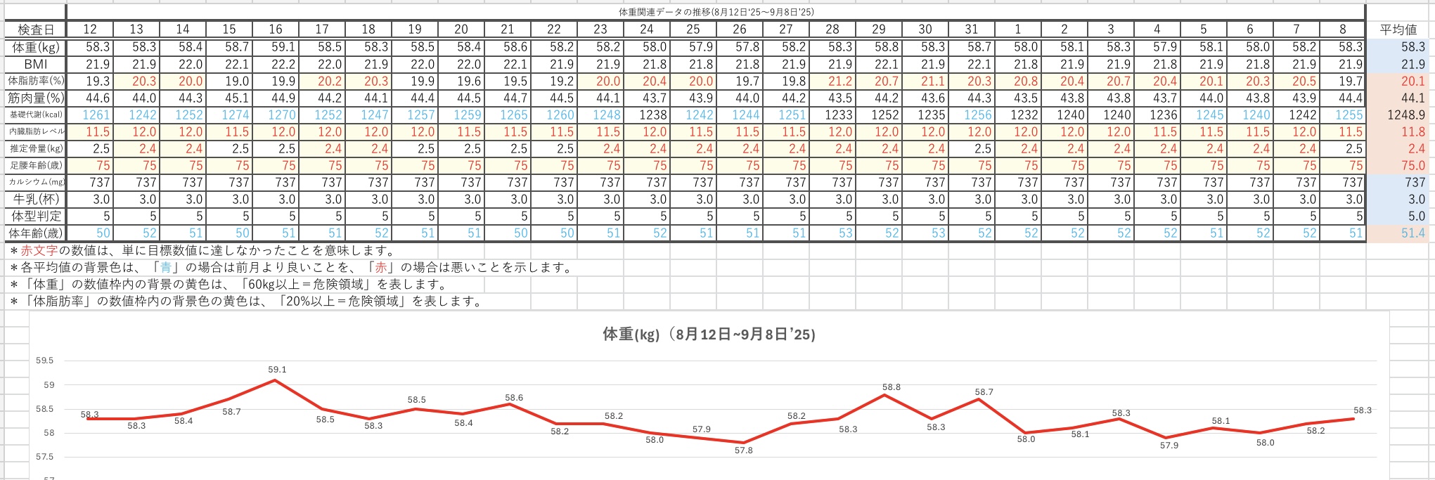 ◆9月11日’25 体重関連推移データ(8月12日~9月8日’25)